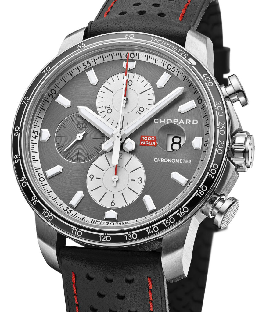 Questa la scheda tecnica del Mille Miglia Race Edition 2021: cassa ø 44 mm, w.r. a m.100, corona a vite e lunetta con inserto in ceramica nera lucida e scala tachimetrica laccata bianca (i 250 esemplari con oro etico rosa hanno in questo metallo la corona e a lunetta, sempre con inserto in ceramica). Sul fondello la scritta Brescia-Roma-Brescia e la bandiera a scacchi che circonda il logo della gara. Il quadrante e il rèhaut sono in color grigio ardesia trattato galvanicamente. Il movimento cronografico a carica automatica è certificato cronometro dal COSC, ha 25 rubini e 28.800 A/h. Dal 2018 il cinturino in pelle traforata ricorda i guanti da corsa, ha cuciture rosse o nere tono su tono, ed è foderato in caucciù con un motivo che ricorda gli pneumatici da corsa Dunlop degli anni ’60,