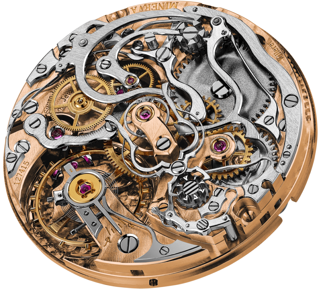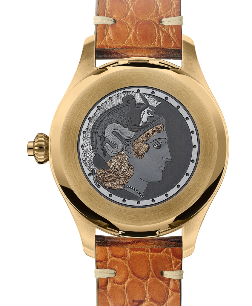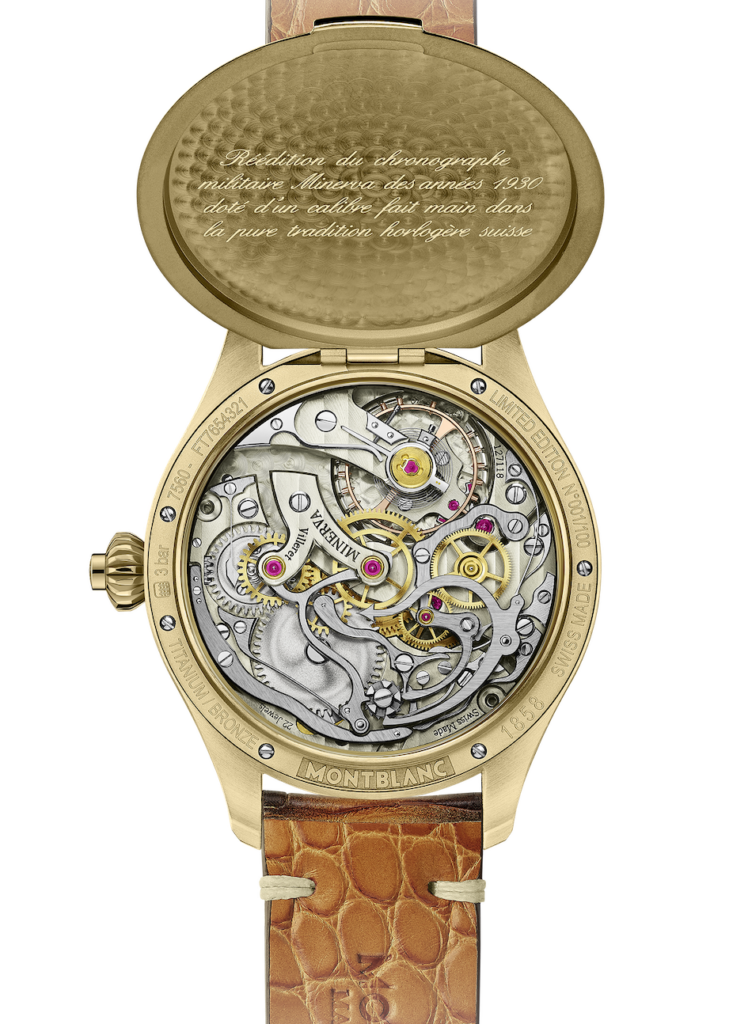 Questa la scheda tecnica dell’Origins Chronograph realizzato in 100 esemplari, cassa ø 46 mm in lega di bronzo con finitura lucida e satinata, quadrante nero con lo storico Marchio Minerva, fondo a vista protetto da un coperchio in titanio, finitura bronzo, che da un lato ha un’incisione commemorativa (Riedizione di un cronografo militare Minerva degli anni ‘30 dotato di un calibro realizzato a mano secondo la tradizione orologiera svizzera) e dall’altro la testa di Minerva; movimento Calibro manuale di Manifattura MB 16.29 con ruota a colonne innesto orizzontale, A/h 18.000, 22 rubini, 252 componenti, carica circa 50 h.