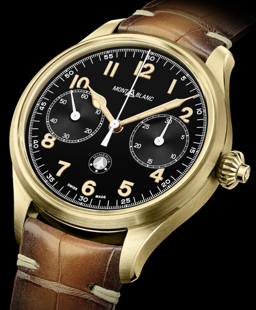 Sempre nella collezione 1858 un altro cronografo in tiratura limitata. 1858 è l’anno in cui Charles-Yvan Robert diede avvio alla storica manifattura Minerva nella valle di Saint Imier; nel XX Sec. questa Manifattura fu acquisita da Montblanc che nel 2007 istituì a Villeret l’Institut Minerva de Recherche en Haute Horlogerie per non perdere nulla di quelle splendide esperienze, che sono poi state ampliate anche per merito di un italiano, Demetrio Cabiddu Maestro Orologiaio, sotto la cui direzione lavoravano più di trenta maestri orologiai. Tornando al cronografo Origins questo modello reinterpreta le origini del know-how cronografico Minerva che aveva realizzato un cronografo militare ø 46 mm negli anni ’30 con il Calibro 19-09CHl, nella foto sotto.