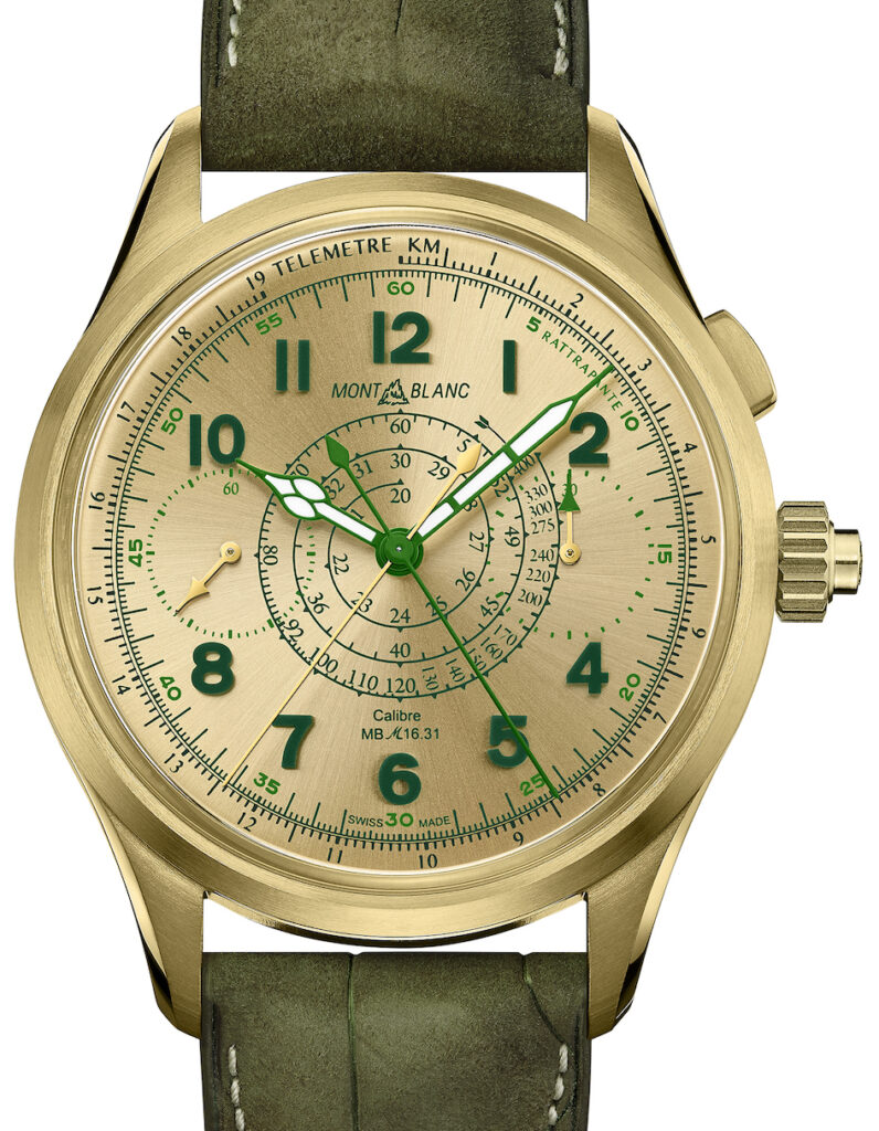 La nuova lega del metallo prezioso si chiama Lime Gold, spontaneo affiancare questo colore a quello scelto per il quadrante color oro con indici verdi trattati Super-LumiNova con un procedimento particolare che, incapsulandoli, li rende monoblocco senza contorni; al centro e sul bordo la scala tachimetrica a chiocciola e quella telemetrica. La cassa, ø 44 mm, ha il fondo a vista per far ammirare il Calibro di Manifattura del cronografo monopulsante MB M16.31 che trae ispirazione da un movimento del 1909 e dall’evoluzione apportata negli anni ’30, ponti e platina sono in alpacca con finitura oro 18K ed effetto graInè circolare, due le ruote a colonna, una è per la funzione del rattrappante; la corona è a vite e integra la cronografia, la funzione rattrappante a innesto orizzontale è affidata al pulsante a ore 2.