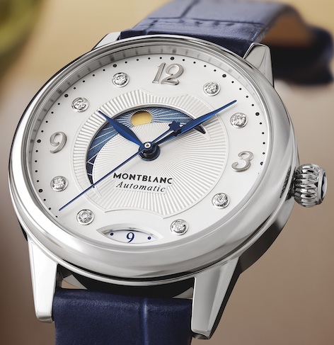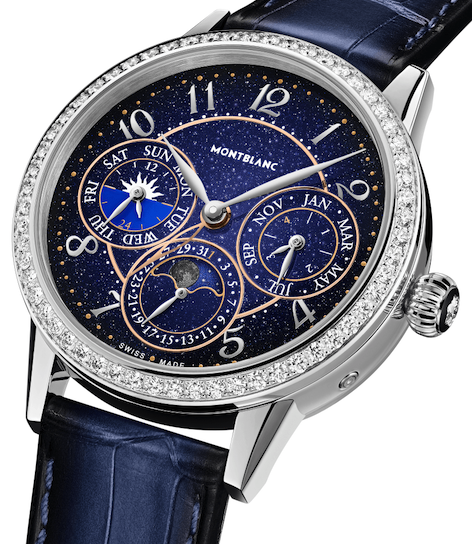 Day & Night, in acciaio levigato ø 34 mm, ma è disponi bile anche in diametro 30 mm e con lunetta in oro osa impreziosita da 72 diamanti, ha la corona personalizzata con il logo Montblanc su madreperla. L’indicazione del giorno e della notte appare da una finestrella arcuata dove il sole lascia il posto alla luna e viceversa in un avvicendarsi continuo; il design del quadrante argenté lavorato a guillochage si completa con l’indicazione della data. Il movimento è il Calibro automatico MB 24-20, 21 rubini, A/h 28.800. Cinturino in vitello blu (o nero) lavorato come alligatore o bracciale in acciaio.