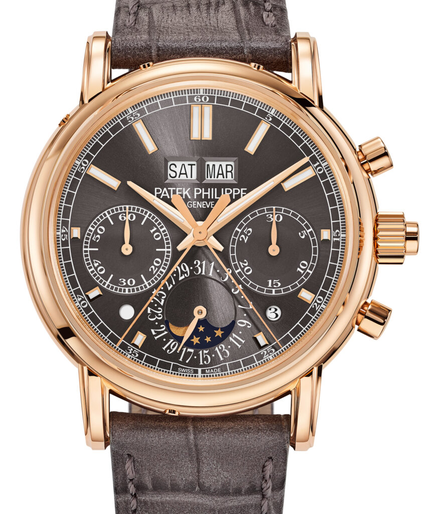 La Ref. 5204R-011, presentata nel 2016 con la cassa in oro rosa e quadrante opaline o nero ebano, oggi alla cassa in oro rosa con fondo in cristallo di zaffiro (ma anche con fondo pieno) mostra il calibro CHR 29-535 PS Q a carica manuale con due ruote a colonne e innesto orizzontale (sette le innovazioni brevettate di cui sei per il cronografo e una per il meccanismo rattrapante). Sul quadrante grigio ardesia alle 12 giorno della settimana e mese; alle 9 e alle 3 piccoli secondi e contatore istantaneo dei 30 minuti, alle 6 le fasi di luna e la data analogica, alle 4.30 il quadriennio, alle 7.30 l’indicazione giorno/notte. A raccontarlo sembra molto affollato, ma nella pratica si legge facilmente.