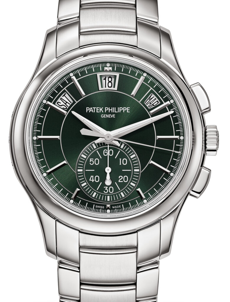 Ref.5905/1A-001, Cronografo automatico flyback con Calendario Annuale brevettato, cassa in acciaio con bracciale integrato ; nella prima versione del 2015 la cassa era in platino, 4 anni più tardi arrivò quella in oro rosa, oggi l’acciaio rende attuale e molto portabile questo cronografo con quadrante verde oliva sul quale leggere i 60 minuti con la lancetta centrale; giorno, data e mese del calendario annuale a semicerchio a ore 12 e a ore 6 nei piccoli secondi anche l’indicazione giorno/notte. Nel movimento, con ruota a colonne, innesto verticale a dischi. Infine ricordiamo che nel Calendario Annuale brevettato il movimento tiene conto automaticamente dei mesi con 30 e 31 giorni, è necessaria quindi un’unica correzione per Febbraio.