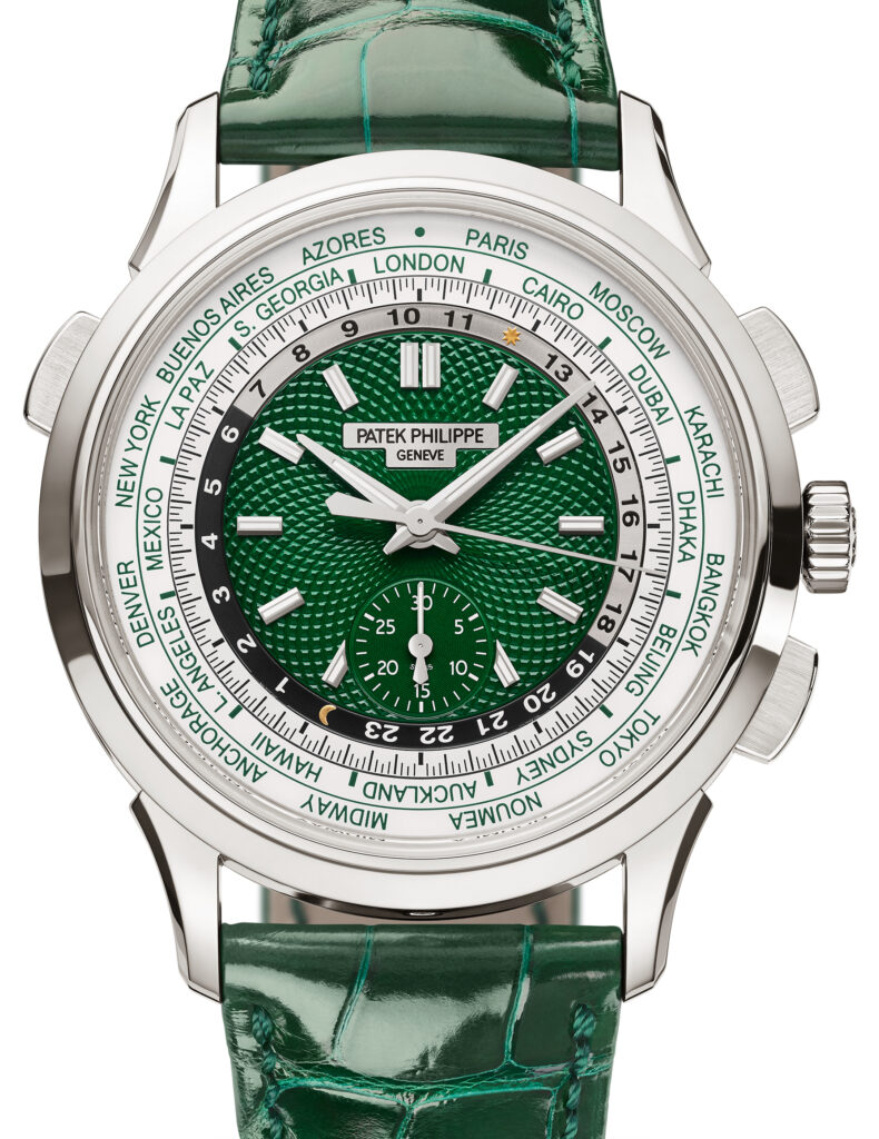 Cronografo automatico flyback e Ora Universale Ref. 5930P-001; la cassa è in platino con anse ad ali e fra queste il tradizionale diamante, con quadrante e cinturino verdi (nel 2016 era in oro bianco, cinturino e quadrante blu). Al suo interno il calibro CH 28-520 HU con ruota a colonne e innesto verticale a dischi; il pulsante a ore 4 avvia la funzione fly-back. Sul quadrante verde brillante, lavorato a guillochage, sono indicate in verde anche le 24 città più importanti; nell’Ora Universale brevettata (cambiando fuso orario con il pulsante a ore 10 si correggono tutte le visualizzazioni senza incidere sulla precisione del movimento) a ore 6 il contatore dei 30 minuti mentre sull’anello delle 24h i due colori indicano il giorno e la notte.