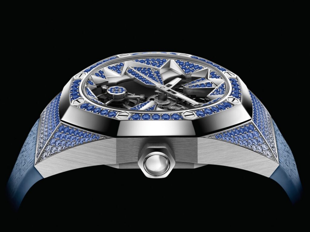 Per chi ama notizie più dettagliate, pensiamo ai due Royal Oak Concept Flying Tourbillon ricoperti da 208 zaffiri blu sfumati taglio baguette che sono stati tagliati in 144 diverse dimensioni per adattarsi alle curve della cassa, all’architettura del quadrante e dei componenti del movimento. L’incastonatura invisibile, che comporta 150 ore di lavoro per ogni esemplare, è fatta grazie a piccole incisioni nelle pietre preziose che poi sono inserite singolarmente su una guida nascosta montata sull’oro, dando l’impressione che si sorreggano da sole.