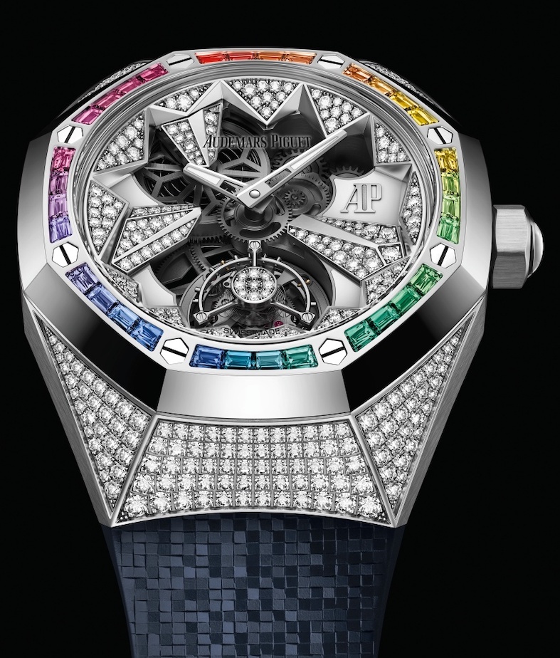 Audemars Piguet, nell’Ottobre 2021, ha impreziosito i Royal Oak Concept con scappamento a tourbillon volante, con una moltitudine di pietre preziose colorate.
