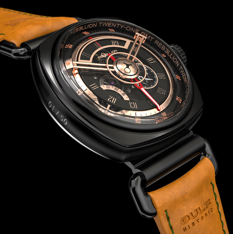 In quanto all’Historic Grand Prix, Rebellion ricorda tutti i suoi segnatempo legati alle gare realizzando un’edizione limitata e numerata di 50 esemplari del Twenty-One Gulf Historic Watch GMT (foto sopra) con cassa a cushion e quadrante dove si fondono elementi attuali e del passato anche nei colori che privilegiano il nero e il rame, movimento automatico Made in Suiss e cinturino con logo dell’evento.