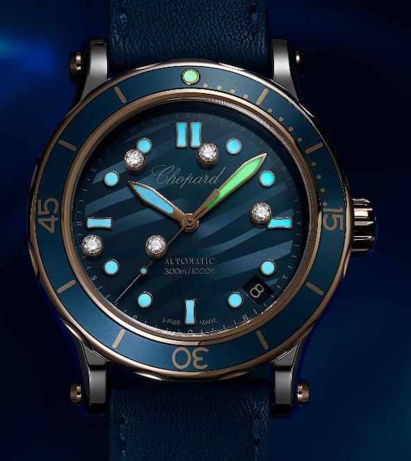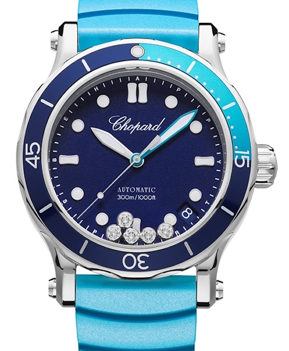 Il nuovo modello femminile si chiama Happy Ocean, in acciaio e oro rosa, ha la cassa w.r. a m.300, ø 40 mm; al suo interno batte il movimento automatico Chopard 01-01-C, 31 rubini, A/h 28.800. La lunetta girevole unidirezionale ha un inserto in oro rosa e la piastrina riempita con SuperLumiNova® come gli indici applicati e le lancette; anche la corona con il logo è in oro rosa. E fin qui niente di particolare rispetto a molti altri orologi Diver, quello che è particolare invece è la presenza dei tradizionali 5 diamanti che identificano la collezione e si muovono liberamente sul quadrante che ha un motivo a onda ed è trattato galvanicamente per assumere un bel colore azzurro. In tonalità coordinata anche il cinturino in vitello o caucciù