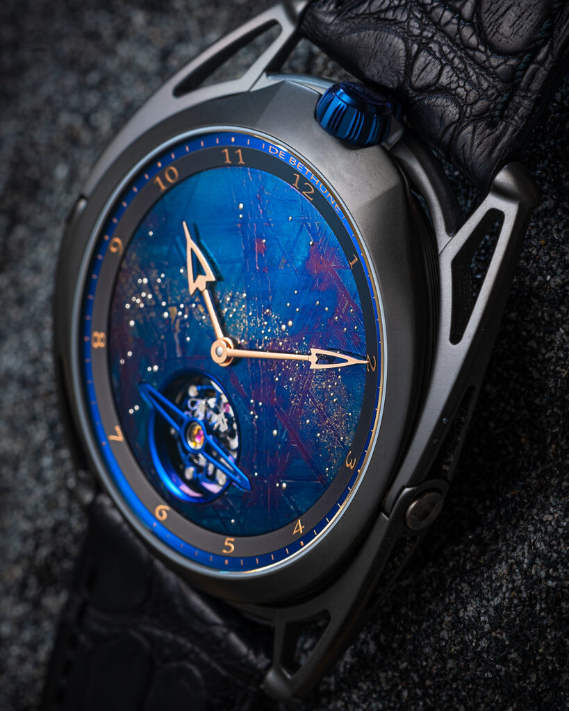 La cassa ø 43 mm, di questo modello, che verrà prodotto solamente in dieci esemplari, è in zirconio nero opaco antracite, nello stesso materiale anche le anse mobili (brevetto DB del 2006), il fondo in zirconio è decorato con l’incisione di un anello in titanio azurrato; il vetro zaffiro, durezza 1800 Vickers, protegge il quadrante in meteorite sul quale spiccano le lancette in oro rosa, in questo colore anche le ore in numeri arabi, i minuti sono in titanio; sullo sfondo in meteorite blu, colore che si ottiene grazie al riscaldamento della pietra, una serie di motivi geometrici formano una texture sempre diversa su ogni quadrante mentre procedimenti di ossidazione dano vita a una via lattea stellata che completa l’illusione di avere al polso un pezzo di cielo.