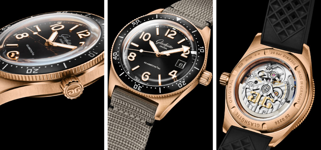 La collezione Specialist di Glashütte.Original per la cassa ø 39,5 mm e spessore 12,15 mm w.r.am.200 con ghiera unidirezionale anti oraria e inserto ceramica nera, ha unito due caratteristiche particolari: da un lato, l’aspetto prettamente sportivo di un Subacqueo che risponde alle normative DIN 8306 e ISO 6425, dall’altro un fondello in vetro zaffiro affinché gli irriducibili appassionati dell’orologeria meccanica possano ammirare il movimento automatico di Manifattura Calibro 39-11.