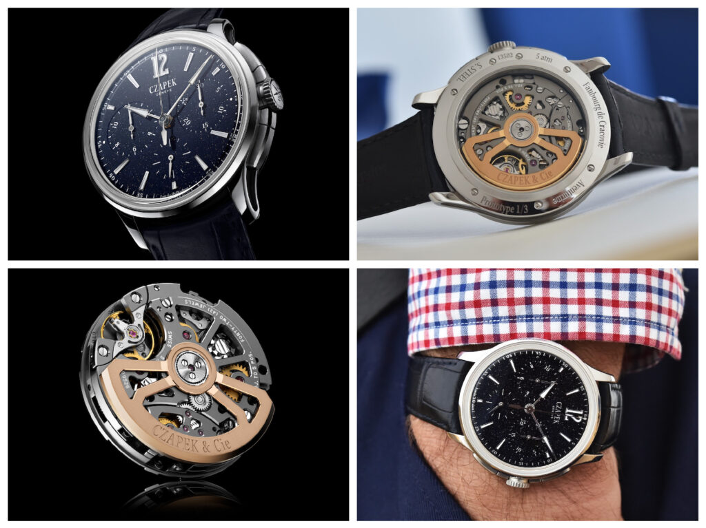 CZAPEK Non è la prima volta che vediamo uno Czapek con quadrante in avventurina, era già successo nel 2019 con un’edizione limitata di un Quai des Bergues, in occasione dell’apertura della boutique della Maison a Ginevra e poi per un ‘Midnight in Geneva S’. la cui cassa era stata ridotta a un diametro di mm 38,5. In seguito è arrivato il modello che viene esposto all’evento newyorkese il cronografo Faubourg de Cracovie, realizzato in cinquanta esemplari e con quadrante in avventurina blu notte. Chi conosce l’avventurina (il cui nome sembra sia nato a Venezia per l’avventura che si affrontava tagliandola) sa bene quanto questo quarzo sia fragile e Xavier de Roquemaurel, CEO di Czapek, ha precisato che nel nuovo cronografo i contatori sono applicati sul quadrante base che, ulteriore difficoltà affrontata, ha indici applicati e non stampati, in numeri arabi o geometrici rivestiti in Super Luminova. La cassa in acciaio ø 41,5 mm (spessore mm 11,5, o 14,6 se.misurata con il vetro zaffiro, ha il fondo in vetro zaffiro e accoglie il movimento cronografico SXH3 a carica automatica, integrato e dotato di certificato COSC di cronometro, con ruota a colonne e innesto verticale, A/h 36.000, carica 65 h, rotore,con inciso il marchio Czapek;
