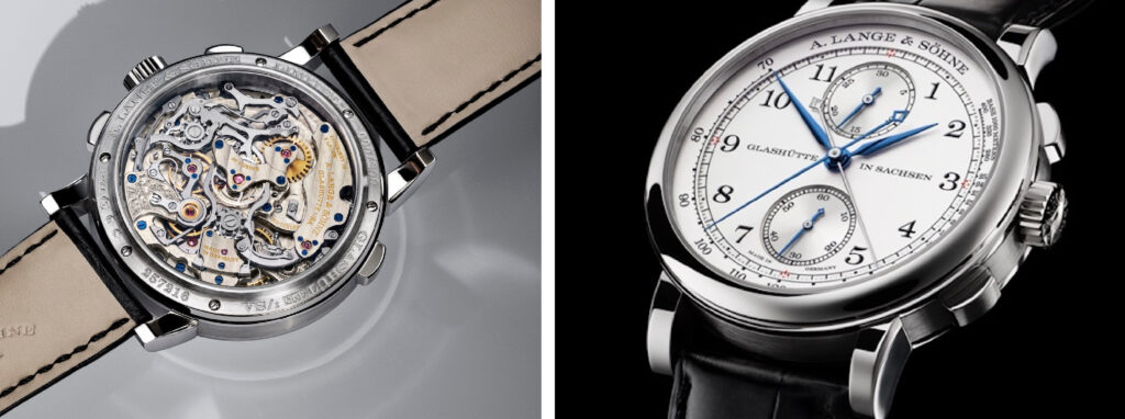 Concludiamo con la fotografia di un orologio da polso presentato questa estate, il rattrapante 1815 con cassa in platino, ø 41,2 mm, realizzato in tiratura limitata a 200 esemplari; un numero che non ci sembra proprio “limitato”, ma è talmente interessante che pensiamo non abbia faticato a trovare 200 appassionati in tutto il mondo. Il movimento, settimo Calibro di Manifattura con questa complicazione, è il Calibro L101.2, a carica manuale, decorato e montato a mano, A/h 21.600, rubini 36, quattro castoni d’oro avvitati; la spirale del bilanciere a libera oscillazione e il bilanciere con viti sono anch’essi realizzati in house. L’intero meccanismo della cronografia rattrapante è visibile dal fondello in vetro zaffiro cosicché si possono seguire i processi di avanzamento del cronometraggio e della misurazione dei tempi intermedi controllati da due ruote a colonna. A carica completa, il bariletto assicura una riserva di 58 ore. In occasione del 175° anniversario della Maison sassone questo movimento ha equipaggio i 100 cronografi in oro Honey, cioè color miele, lega esclusiva della Marca, omaggio a F.A.Lange.