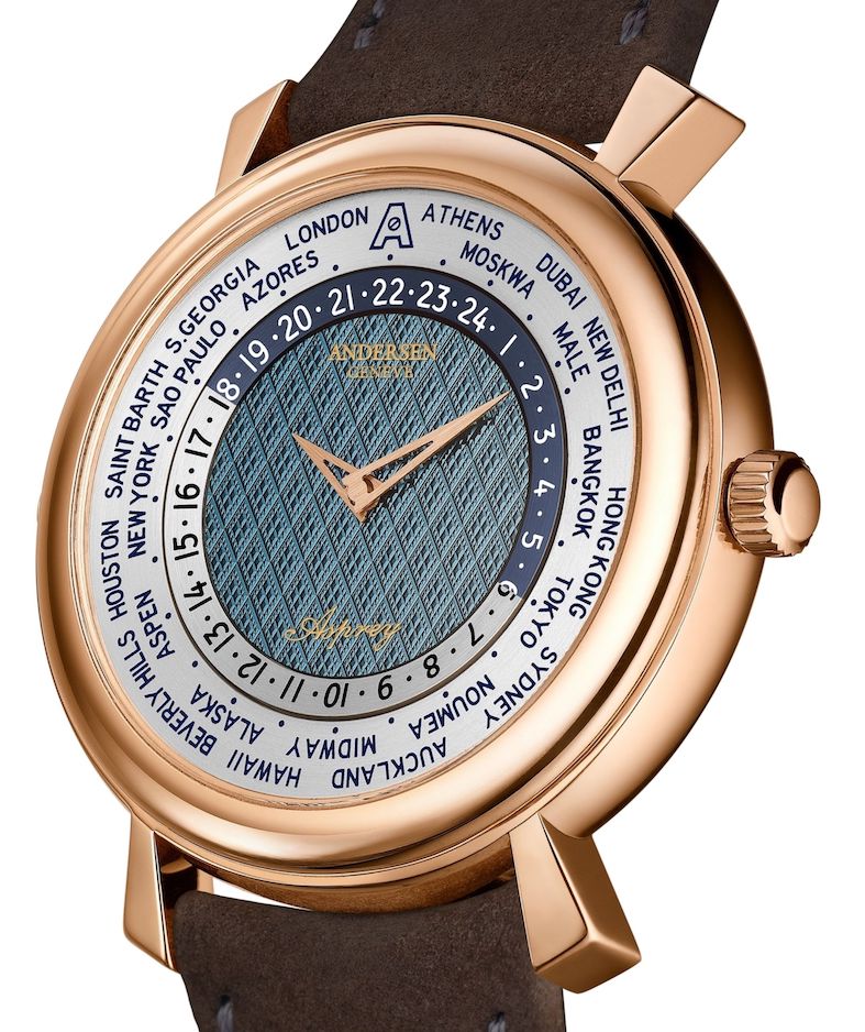 I nomi delle 24 importanti città del mondo sono scritti in inglese, su fasce silver che rinserrano un centro accuratamente lavorato a guillochage sul quale spiccano, dorati, i nomi Andersen Genève e Asprey, quest’ultimo in un elaborato corsivo che riporta a un’era, definita dagli inglesi “bygone”, che non tornerà più, ma che mantiene inalterato il suo fascino. Una volta di più Londra si dimostra una calamita per un pubblico di VIP, l’edizione conta solo 24 esemplari,