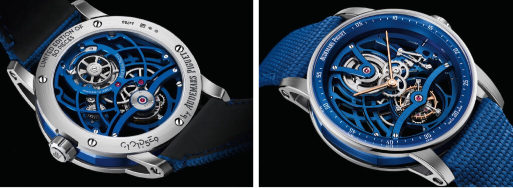 Per un terzo modello Code 11-59 è stata scelta invece la ceramica blu elettrico unendola all’oro bianco per dare vita a un Tourbillon squelette a carica manuale Calibro 2948 (A/h 21.600, 19 rubini, autonomia 79 h) davvero affascinante. La cassa ø 41 mm ha una lunetta piatta in oro bianco mentre la ceramica blu che era già stata impiegata due anni fa nei Royal Oak Offshore, nel 2020 è la prima volta che compare su un Code 11.59. Oltre che per la carrure e la carrure la ceramica blu impreziosisce elementi scheletrati e il réhaut laccato, le lancette sono in oro rosa e sul fondello in vetro zaffiro e oro bianco è inciso “Limited Edition of 50 pieces”. Il cinturino integrato con le anse è in caucciù testurizzato blu rivestito in pelle di vitello.