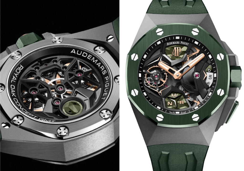 Nel Royal Oak Concept Flying Tourbillon GMT, la cassa ø 44 mm.(spessore 16.1) w.r. a m.100, è in titanio, sabbiato; la lunetta, per la prima volta è in ceramica verde satinata, pulsanti e corona avvitata in ceramica verde, protezioni dei pulsanti in titanio sabbiato. Sul quadrante secondo fuso orario alle 3 con lastra in vetro zaffiro, indicatore della posizione della corona a ore 6, lancette Royal Oak in oro rosa con rivestimento luminescente, réhaut nero. Il movimento, lanciato nel 2015, è il Calibro 2954 a carica manuale (A/h21.600, 24 rubini, carica 237 h) che offre un bel contrasto tra i ponti in PVD nero e gli inserti colorati in CVD (Deposizione Chimica da Vapore) verde; inoltre è stato applicato uno strato sottilissimo di colorante verde, sviluppato appositamente per l’occasione. Cinturino in caucciù verde con chiusura déployante in titanio sabbiato e uno supplementare in caucciù nero.