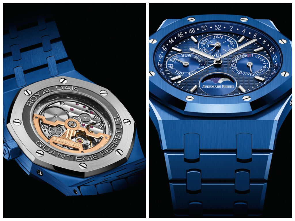 Nel Royal Oak calendario perpetuo – il primo R.O. con cassa ø 41 mm e bracciale rifiniti in ceramica blu elettrico – il movimento, Calibro 5134 a carica automatica visibile dal fondello in vetro zaffiro, ha la massa oscillante scheletrata in oro 22 carati (lanciato nel 2015 ha la parte più spessa del rotore collocata sul bordo esterno in un canale che circonda il movimento consentendo così anche grazie a un bariletto sospeso di avere un movimento dallo spessore molto contenuto: mm 4,3; lo spessore della cassa invece è di mm 9,5); le A/h sono 19.800, i rubini 38 e l’autonomia di 40 h. Sul quadrante blu con motivo Grande Tapisserie lancette sfaccettate e indici applicati in oro bianco, i tre contatori del calendario e le fasi di luna. Il bracciale ha la chiusura deployante in titanio.