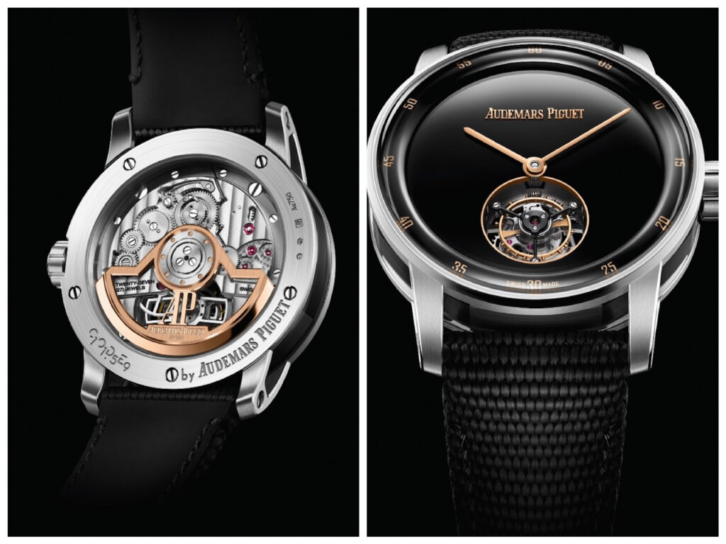 La cassa in oro bianco ø 41 mm, Per il quadrante in onice del nuovo Code 11-59, Audemars Piguet ha chiesto la collaborazione dell’azienda specializzata Soneco di La Chaux-de-Fond, mentre per l’impiego della ceramica nera si è rivolta all’azienda svizzera Bangerter, tuttora nelle mani dei fondatori. Questo per sommi capi, il procedimento per ottenere la ceramica: la polvere di Ossido di Zirconio (ZrO2) viene associata in una composizione segreta, passando poi alla forma preliminare con la tecnologia di una macchina CNC a 5 assi di ultima generazione: dopo questo primo processo l’agglomerante viene rimosso, passando alla sinterizzazione a circa 1.400 gradi e prima di essere lucidato e presatinato, viene lavorato con utensili diamantati di alta precisione. Infine, come i componenti in oro, anche la ceramica è affidata all’abilità orologiera degli addetti, affinché le superfici combacino perfettamente. La cassa ø 41 mm , spessore mm 11,8 è in oro bianco come lunetta, anse, fondello e corona; la carrure in ceramica nera. Il movimento con scappamento a Tourbillon è il Calibro automatico di Manifattura 2950, (A/h 21.600, rubini 27, carica 65 h, visibile dal fondo in vetro zaffiro, con rotore centrale (dal 2019) e massa oscillante in oro finemente decorata). Il cinturino nero rivestito in caucciù ha la fibbia déployante AP in oro bianco. Infine ricordiamo che i quadranti in pietra naturale (occhio di tigre, lapislazzuli, avventurina, granato grossularia, madreperla, opale, rubino, ametista, diaspro, onice) sono stati molto impiegati da Audemars Piguet negli anni ’60, tornando nella collezione Millenary e Royal Oak nel primo decennio del nostro secolo.