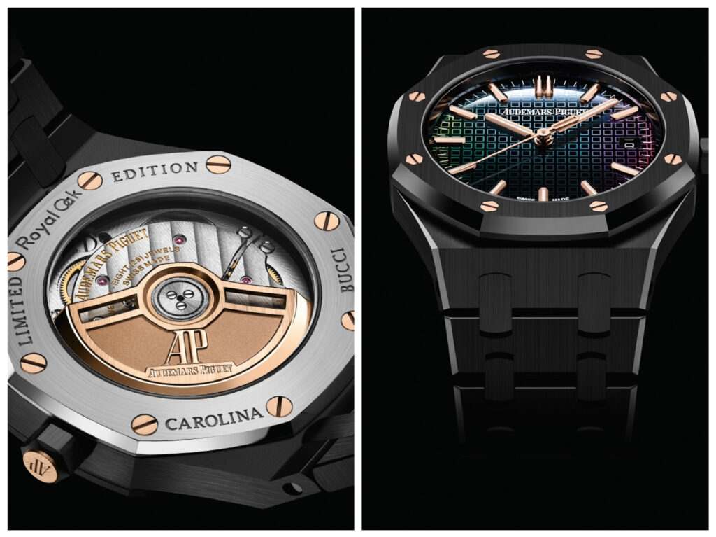 La cassa in ceramica nera, ø 34 mm, ha la lunetta fissata con viti esagonali in oro rosa; la corona reca la sigla AP sull’oro rosa; nel bracciale in ceramica i perni delle maglie collegate alle anse sono integrati nelle anse stesse e quindi sono invisibili, la fibbia deployante in titanio reca la sigla AP. Sul fondello in titanio e vetro zaffiro l’incisione “Limited Edition Carolina Bucci”. Il movimento automatico di Manifattura è il Calibro 5800 composto da 186 elementi, indica ore, minuti, secondi e data; la massa oscillante in oro rosa 22 carati presenta finiture micropallinate, lucidate e satinate; i rubini sono 29 e la carica è di 50 ore.