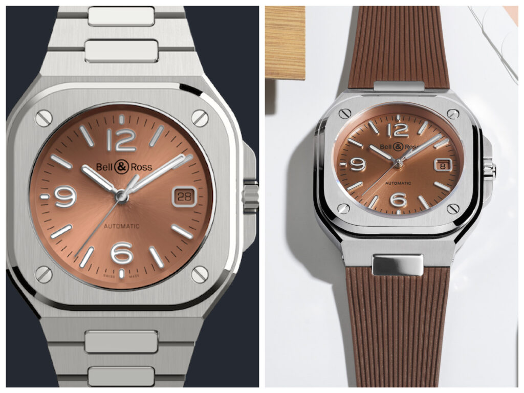 Bell&Ross ha presentato una versione cromaticamente molto indovinata del BR-05, che alla tradizionale cassa in acciaio tonda inserita nel quadrato e fissata con 4 viti del BR-03, abbina un quadrante marrone ramato con finitura soleil.