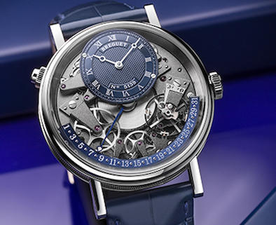 Per tutti coloro che comprendono le difficoltà di produrre orologi meccanici complicati, sarà un piacere vedere, dal quadrante open work, il susseguirsi dei movimenti dei 269 elementi che compongono il Calibro 505Q a carica automatica (spessore mm 8,7, A/h 21.600, riserva di carica 50h, scappamento ad àncora in linea inversa e anse in silicio, massa oscillante in oro bianco, che riprende la forma di quella voluta da Abraham Louis Breguet nel 1780) che si ammira anche dal fondo in vetro zaffiro. La cassa ø 40 mm è in oro bianco, il quadrante alterna due accurate scelte cromatiche, un grigio antracite per infondo sul quale risaltano i diversi componenti in movimento e un blu regale per l’indicazione del trascorrere del tempo che al centro ha una lavorazione a Clous de Paris, analogo colore per l’indicazione della data a retrograde a bordo cassa; infine il cinturino è in alligatore blun otte con fibbia ad ardiglione in oro bianco.
