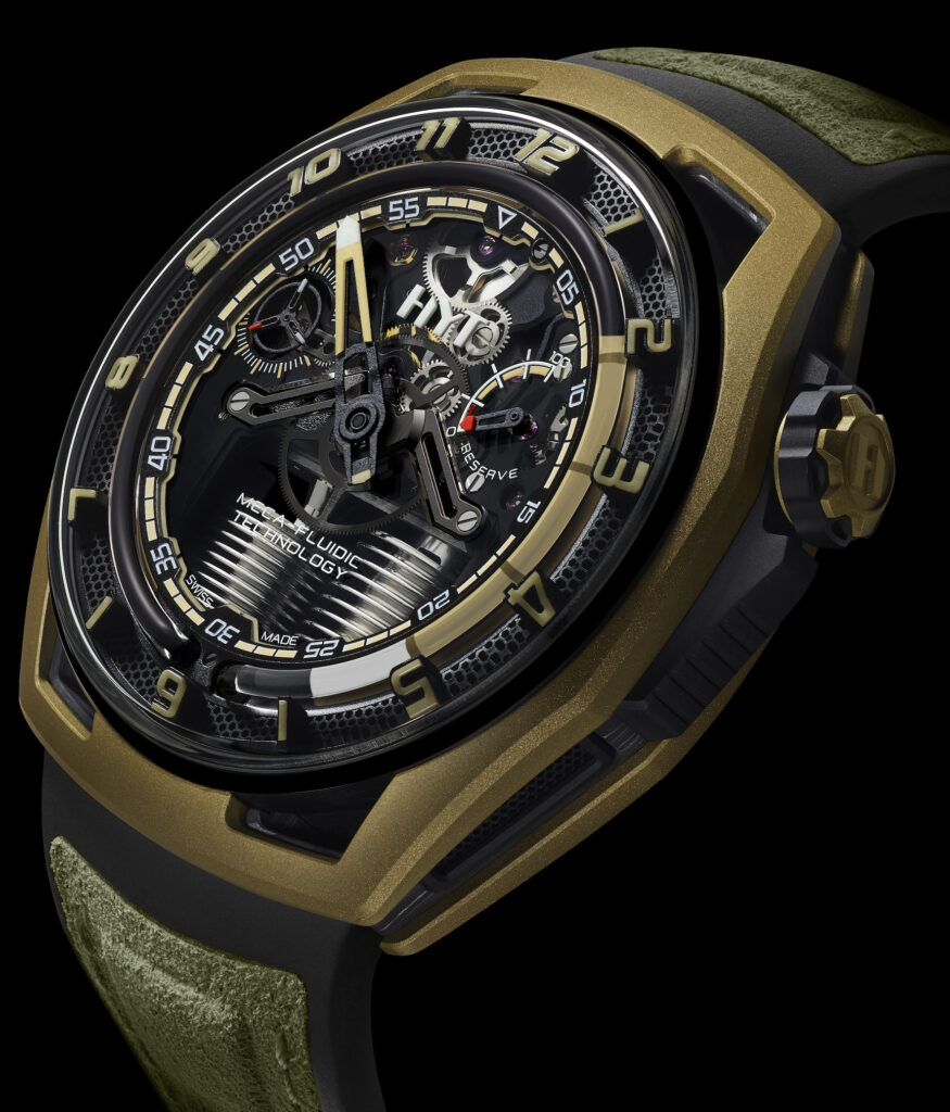 La cassa in carbonìo e titanio (mm 48 x 52, spessore mm 17,2) è trattata PVD bronzo con finitura microbillée. Sotto il profilo estetico, oggi così importante, da notare che questo colore viene esaltato dal nero del quadrante sul quale risaltano le cifre beige in Lumicast®, nuova applicazione tridimensionale di Super-LumiNova®; lancette in nero opaco e altrettanto nero il fluido nel sistema che indica il trascorrere del tempo. In quanto al movimento ormai ben noto, ideato da Eric Coudray®, c’è poco da aggiungere, questo Maestro orologiaio è stato un precursore e ha mantenuto le promesse e le premesse da cui era partito. Infine un altro atout di questo segnatempo è la tiratura limitata a 27 esemplari.