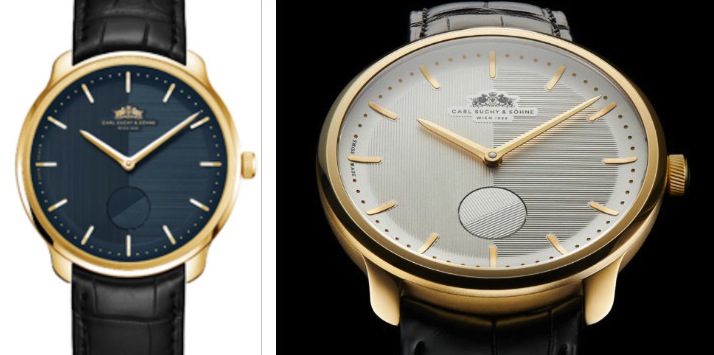 … Carl Suchy & Söhne è tornato a vivere grazie anche al maestro orologiaio Marc Jenni; il Marchio viennese, che tra i suoi clienti vantava anche membri della Casa imperiale, è di nuovo in campo con il Waltz n° 1 in oro, nella foto sopra, movimento automatico con microrotore decentrato, 21.600 A/h, Calibro VMF 5401 della Manifattura Vaucher Fleurier; sul quadrante lavorato a guillochage il disco rotante alle 6 indica i secondi allineando al termine la decorazione verticale a quella del quadrante.