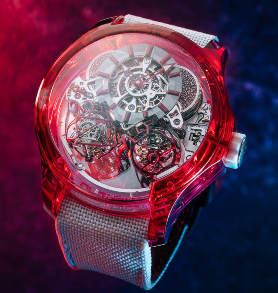 Al Carrè des Horlogers l’attenzione dei visitatori è stata polarizzata dall’Absolute Sapphire Hancock Red, un segnatempo la cui cassa ha il colore delle piume rosse del gallo. Maurizio Mazzocchi, CEO di Purnell, ricorda che, avendo visto con quel colore una gemma straordinaria battuta da Christieìs nel 1987 a New York, un “fancy red”, aveva chiesto al team aziendale di riprodurlo, sicuro che quel colore, mai ottenuto prima, avrebbe dato un ulteriore atout al movimento ideato da Eric Coudray.