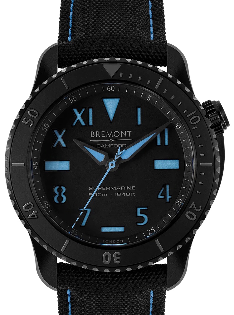 Così nel nuovo orologio nato a The Wing, troviamo accentuate le doti di Bamford e quelle di Bremont, colori come il California Blue Super-LumiNova® di indici e lancette su un quadrante realizzato a strati (un primo strato di materiale luminescente è poi coperto dal quadrante con le necessarie aperture), mentre la cassa, trattata DLC, ø 43 mmm w.r.a 50 Atm (m.500), è nero profondo ed è dotata della valvola automatica per il gas elio e di proteggi corona, la lunetta unidirezionale è in ceramica con inserto indicatore, sul fondo incisione dei Diver; cinturino in tessuto marinaro nero con impunture blu.