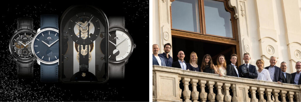 Il biglietto di auguri con gli orologi presentati alle rassegne del 2022 e il team direttivo del Marchio, affacciato ad un balcone nella Vienna Imperiale. soloPolso si unisce a tutti gli appassionati della più bella orologeria per ricambiare gli auguri di un 2023 durante il quale le campane viennesi suonino a distesa.
