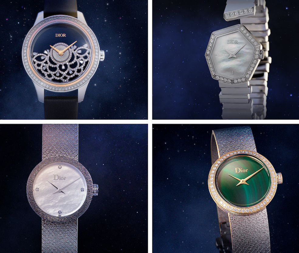 DIOR – la Maison francese è più indirizzata verso i gioielli, ciò nonostante i quattro orologi che pubblichiamo, anche se non recentissimi, ma sempre in collezione, sono tra i suoi bestseller; a partire dal Grand Bal Dentelle, ø 36 mm con movimento automatico inversé, che mostra la massa oscillante lato quadrante, al Gem Dior ø 27 mm con movimento al quarzo, cassa in metallo prezioso e diamanti, per finire con i Mini D De Dior anch’essi al quarzo, ø 19 mm, molto preziosi; tutti disponibili in boutique.