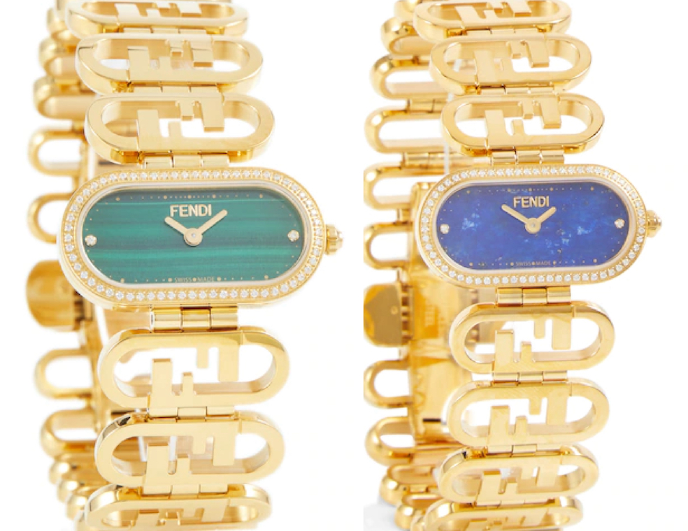 FENDI – Nella collezione O’Lock con cassa ovale orizzontale in acciaio trattata IP color oro giallo, anche una versione verticale (sempre mm 14,80 x 21,30) con diamanti per venire incontro ad ogni desiderio. La doppia FF si ammira sulla cassa e soprattutto sulle maglie del bracciale; il movimento è sempre al quarzo svizzero, il quadrante è in vari colori.