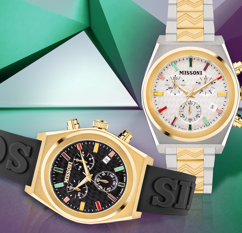MISSONI – per una donna sportiva che non teme di indossare orologi con cassa imponente, la nuova collezione Active 331 propone cronografi con movimento al quarzo Swiss Made, cassa ø 40 mm trattata IP Champagne o bicolore, quadranti nero o bianco argento lavorati a guilloché zig-zag con indici smaltati multicolore, cinturino nero in gomma Mango e fibbia ad ardiglione o bracciale bicolore (SS & IP Champagne) e fibbia a farfalla, in entrambi i casi c’è un sistema rapido per la sostituzione.