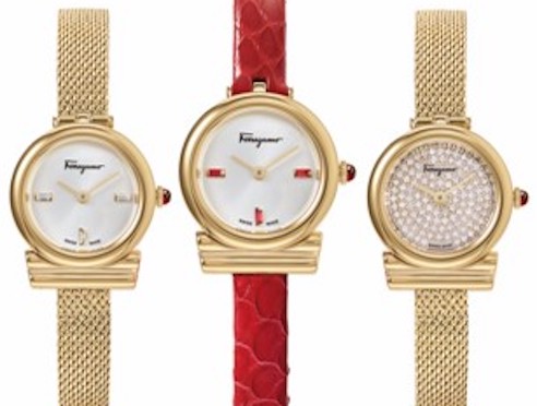 FERRAGAMO – l’iconica collezione Gancini Holiday Capsule tra i colori oro e rosso, ha la cassa in acciaio trattata IP oro giallo ø 28 mm e corona con cabochon; sul quadrante smaltato indici in rubini o in diamanti e anche la più preziosa versione full pavé diamanti con bracciale mesh e fibbia, o cinturino in pelle “elaphe” rossa con chiusura ad ardiglione (entrambe con logo); movimento al quarzo svizzero (Eta 901.001).
