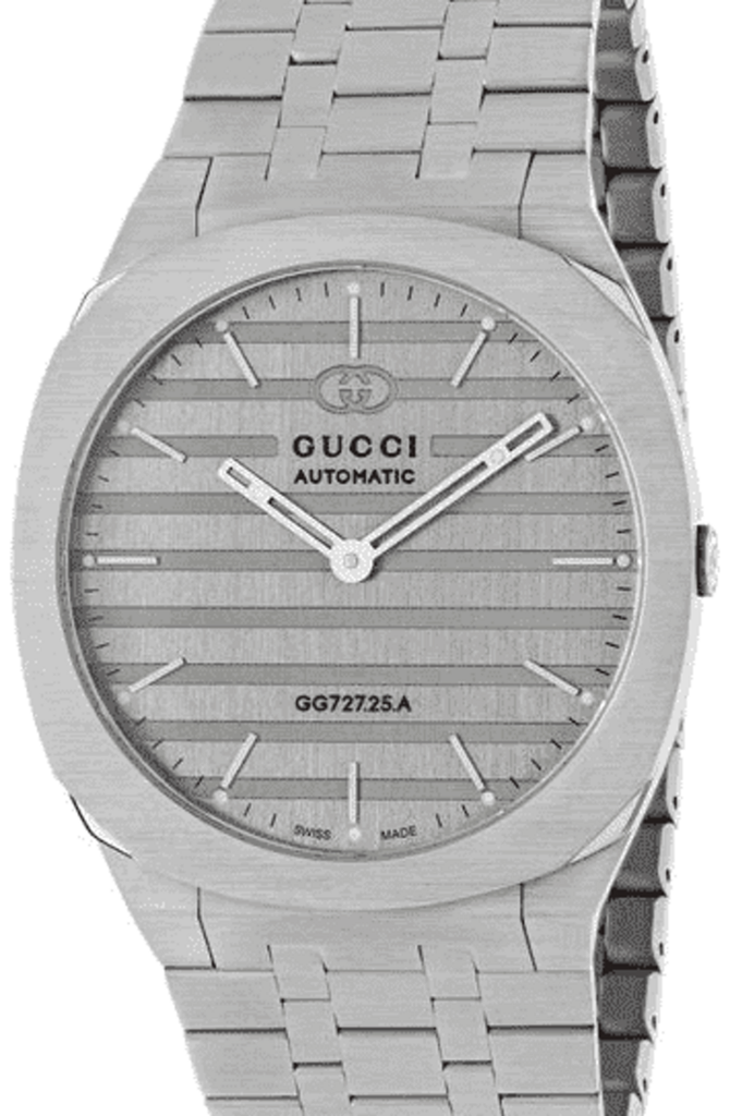GUCCI – il marchio fiorentino, fondato nel 1921, è stato il primo a trasferire lo stile della Maison in un orologio fashion e ha poi continuato ponendo attenzione anche ai movimenti (ci sono anche orologi Gucci con il tourbillon); nelle principali collezioni molti gli automatici e le casse molto sottili. Prima di lasciare Baselworld con il Gruppo Kering di cui fa parte, la Maison era arrivata ad avere uno stand su tre piani di oltre mille metri quadrati. Dopo i molti cambiamenti degli ultimi anni, la collezione 25H, numero caro a Alessandro Michele che però non è più il creativo della Marca, insieme ai Dive e ai Timeless è fra quelle di punta; le collezioni d’Alta Orologeria (il G.Timeless Moonlight è indicato per un super regalo natalizio con movimento calibro Gucci GGV838.MP e sul quadrante, oltre alle varie fasi della luna da regolare solo dopo 360 anni, c’è anche una stella cometa) pongono Gucci in una sfera particolare, così come il negozio parigino al 16 di Place Vendôme per alta gioielleria e orologeria. La collezione 25H ha la cassa sfaccettata in acciaio inossidabile ø 40 mm (spessore mm 7,10) anche impreziosita con diamanti sulla lunetta, fondo a vista, quadrante grigio scuro spazzolato (o in una serie di colori pastello flou) con incisione rossa, movimento Calibro GG 725,25 automatico, carica 60h. Altre misure della cassa mm 38 e mm 30, quest’ultima con movimento al quarzo. Bracciale in acciaio inossidabile a 5 maglie.