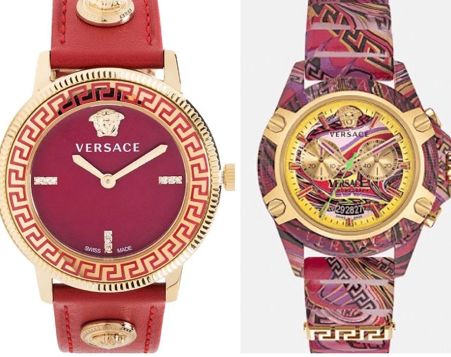 VERSACE – Dall’iconico modello Medusa declinato in varie versioni, rotonde o rettangolari, ma sempre attuale nei suoi colori rosso e oro, sino al più fantasioso Icon Active, ø 44 mm con movimento al quarzo, in cui si vede il disegno della greca ripreso in diversi colori su cassa, lunetta e cinturino, sul quadrante a ore 12 la Medusa del Marchio.