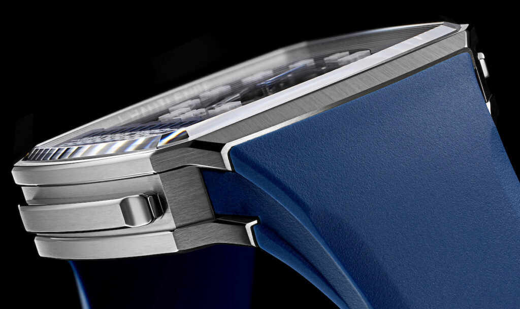 Il Calibro D50 a carica automatica, scelto per i Linear 1, dispone di un modulo realizzato insieme ad Agenhor; ha 239 componenti, lo scappamento a tourbillon volant (la gabbia ruota in un minuto9), A/h 21.600, 39 rubini e una carica di 72 h; la massa oscillante elegantemente decorata ricorda quella del Moebius; l’ora saltante lineare retrograde si è affiancata alle precedenti soluzioni adottate dalla Maison. Sul quadrante le ore si leggono a sinistra; sul quadrante inferiore in ottone rodiato e scheletrato, con lavorazione satinata verticale, i minuti sono incisi, su quello intermedio la minuteria bianca e blu è stampata; gli indici luminescenti sono visibili anche al buio.