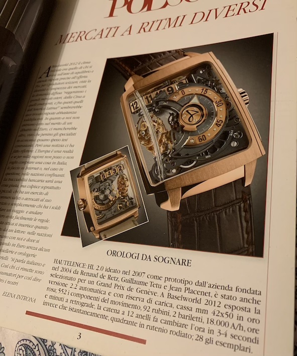Noi l’abbiamo conosciuta quando H.Moser & C. e il Gruppo Melb, esponevano nell’Hotel Ramada di Basilea, a poche decine di metri da Baselworld. Dopo la scomparsa, a fine 2010, di Eugenio Zigliotto, editore di POLSO, avevo modificato l’impostazione grafica della rivista di cui ero Direttore Responsabile e al posto di un lungo Editoriale, avevo dedicato una colonna a un argomento d’attualità e due agli “Orologi da sognare”, tra questi, nel 2012, scelsi un Hautlence, l’HL 2.0 in versione automatica con ore e minuti a retrograde trascinati da una catena a 12 anelli.