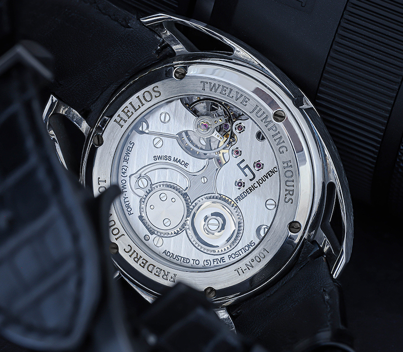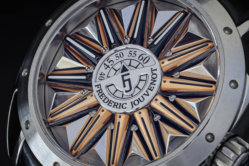 L’elemento che comanda questo gioco del movimento meccanico ideato da Jouvenot, è una gabbia centrale con diametro di mm 12.916 e spessore di mm 5 che, grazie alla micromeccanica, accoglie 100 componenti inclusi 24 rubini; per far comprendere meglio l’eccezionalità di questo risultato, basta pensare che normalmente una gabbia dello scappamento a tourbillon comprende 80 elementi. A mezzogiorno le strutture sono luminose per poi oscurarsi a mano a mano che indicano le ore successive (a mezzanotte sono tutte scure), al centro del quadrante un disco rotante mostra i minuti. La cassa ø mm 44 è on titanio; ilmovimento ha 28.800 A/h la carica è di 50 h.