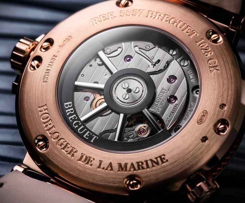 Nella cassa ø 43,9 mm in oro bianco o rosa, rispettivamente Ref.5557BB/YS/5WV e 5557BR/YS/5WV, w.r. a 10 Bar, spessore mm 13,80, il fondo ha un oblò in vetro zaffiro e mostra non solo il n° che distingue ogni Breguet, ma anche l’indicazione Horloger de la Marine, onore che Abraham Louis Breguet ottenne dal Re di Francia. Il movimento, che comprende 384 elementi, è il Calibro 77F1, automatico con scappamento in silicio molto resistente a corrosione, usura ed antimagnetico; il bilanciere oscilla a 28.800 A/h, la carica è di 55 h e il rotore ricorda la ruota nautica. I moduli brevettati sopra accennati, consentono il doppio fuso orario, la visualizzazione istantanea del secondo fuso orario, il meccanismo di memoria riprogrammabile e la visualizzazione giorno/notte. Tutte indicazioni che avvengono automaticamente coinvolgendo le lancette centrali e le finestrelle.