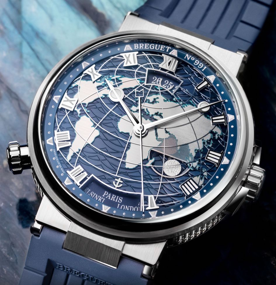 Sul quadrante blu, che ricorda il mare con le onde, la mappa del mondo e indici in cifre romane; infine il cinturino è in pelle o caucciù, ma per chi lo preferisce c’è il bracciale nel metallo della cassa.