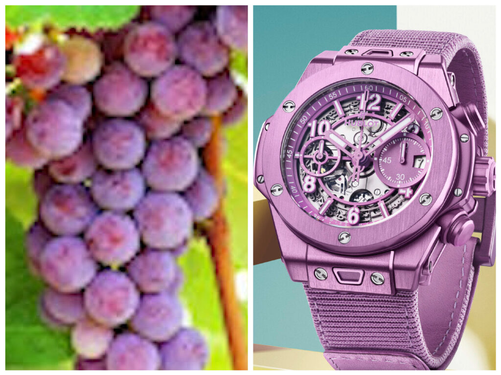 Sarà colpa dello schermo del mio computer, sarà che purple, cioè porpora, (un rosso regale) non sembra aver nulla a che vedere con il colore di questo Big Bang, così ho fatto una breve ricerca cromatica e in rete ho trovato la foto di un grappolo di uva fragola che mi sembra si avvicini meglio alla tinta scelta per la cassa in alluminio anodizzato lucido e satinato, per il réhaut del quadrante e i contatori.