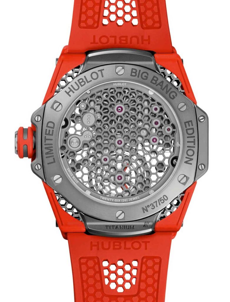 Il nuovo Big Bang Tourbillon, realizzato tiratura limitata e numerata (50 esemplari) ha la cassa ø 44 mm, il fondo e la lunetta in titanio satinato e lucidato, il quadrante è in zaffiro e il movimento di Manifattura visibile dall’originale struttura del fondello, è il Calibro automatico HUB6035 scheletrato, con microrotore, A/h 21.600, carica 72h, 26rubini. Il cinturino arancione,integrato nella cassa, è in caucciù con fibbia deployante in titanio.
