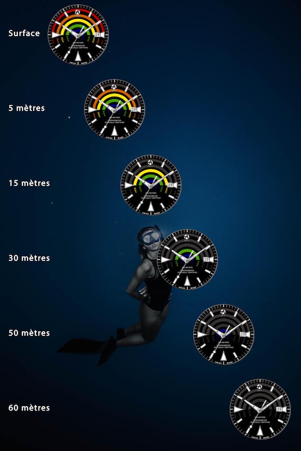 Partiamo dall’inizio spiegando come, in questa collezione di orologi Plongeur, i colori sul quadrante scompaiano mano mano che si scende in profondità.