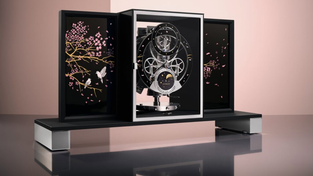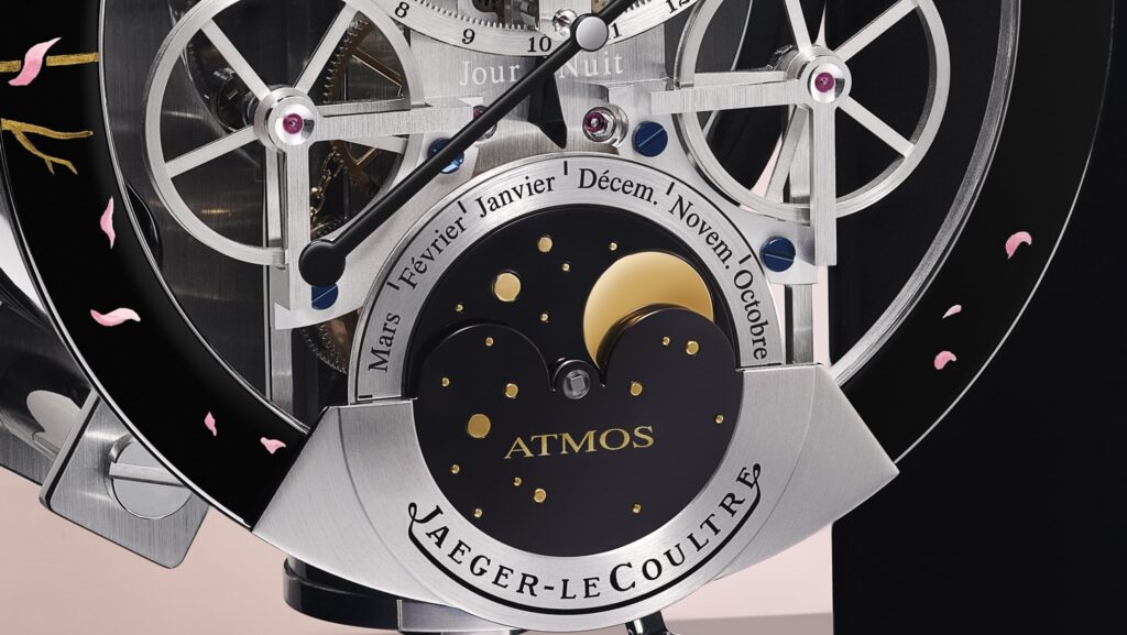 Tornando al Cherry Blossoms e alla poesia dell’arte nipponica con i fiori di ciliegio, per realizzare i due pannelli decorativi (mm 105,2×196) in smalto Grand Feu (tecnica che ha comportato 200 ore di lavoro), gli artisti della Maison, dopo molte prove ed esperimenti, visto l’ampio spazio da dipingere, hanno impiegato la pittura in miniatura, con tecnica a secco su fondo in rame. il Calibro Jaeger-LeCoultre 582 montato sull’Atmos Cherry Blossoms, con architettura a cerchi concentrici, ha l’anello dei minuti e quello più piccolo delle ore, in argento dipinto, è completati da un calendario mensile e dall’indicazione delle fasi lunari, così precise che per indicare un giorno di differenza con la realtà astronomica occorre attendere 3.821 anni. La pendola misura 468 mm x 183 mm x 255 mm.