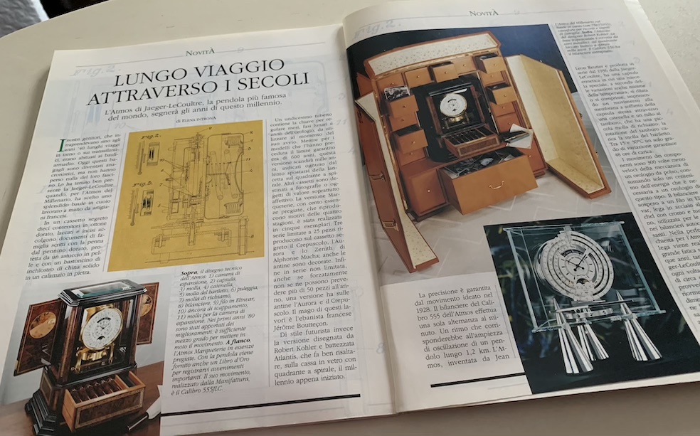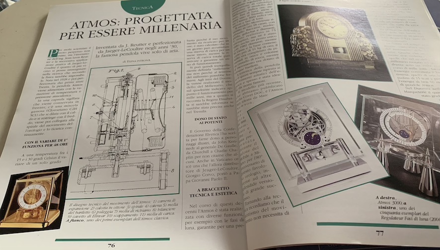 Sfogliando la raccolta di orologi da POLSO abbiamo trovato molti articoli sull’Atmos; visitando lo stabilimento di Le Sentire, alla fine del secolo scorso, avevamo fatto un piacevole incontro: la responsabile del reparto dove venivano custoditi i cuori pulsanti di queste pendole, era una gentile Maestra Orologiaia italiana. Tra gli altri aneddoti ricordiamo che un esemplare dell’Atmos del Millennio è stato murato all’ingresso dello Maison, si potrà riaprire questa temporanea cassaforte solo fra 500 anni. Nessuno di noi ci sarà, ma guerre e pandemie a parte, ci auguriamo che le generazioni future possano sincerarsi della longevità dell’Atmos.