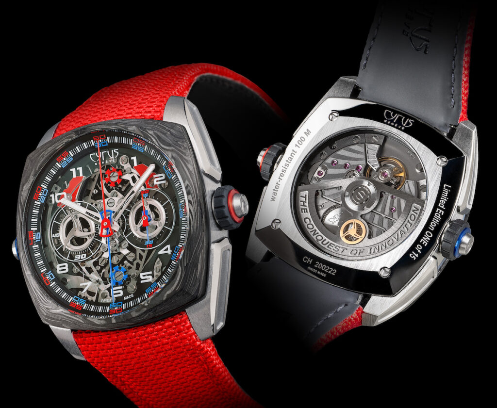 Il movimento di Manifattura è il Calibro automatico CYR718 con due ruote a colonna (A/h 28.800, rubini 51 di cui 17 per il modulo cronografico, un bariletto, riserva di carica 60 h, platina microbillé trattata PVD nero, ponti antracite decorati a rilievo); sulla massa oscillante monoblocco traforata con finitura soleil, l’incisione “The Conquest of Innovation”, il medaglione centrale traforato con l’elica simbolo di Cyrus, è in oro. Sul quadrante tre D traforato, lancette traforate rodiate trattate SuperLuminova e due lancette cronografiche centrali (alle 6 reset per quella blu e alle 12 per quella rossa), anello delle ore in cristallo zaffiro, indici minuti sul réhaut con doppia scala cronografica in blu e rosso; piccoli secondi e contatore 30 minuti con anello fumé in vetro zaffiro; infine laccati rossi il ponte contatore minuti e piccoli secondi e la ruota a colonne.