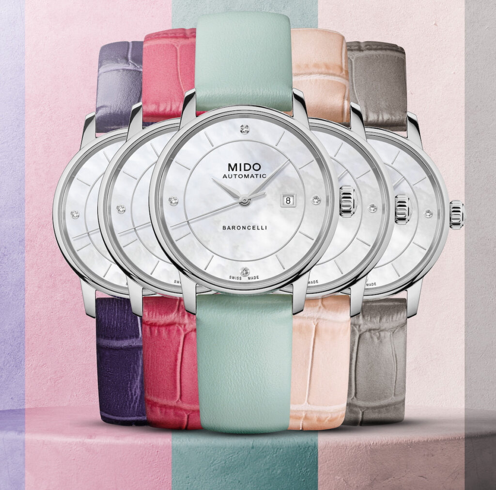 Mido, nella speciale collezione Baroncelli Signature, ha realizzato un nuovo modello molto femminile, cassa in acciaio ø 30 mm, che grazie ai cinque cinturini facilmente intercambiabili, si adatta rapidamente ad ogni abbigliamento.