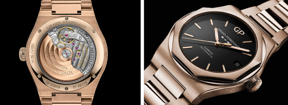 Il savoir-faire dei Maestri artigiani elvetici si nota nel trattamento dell’onice impiegato per li quadrante, che comporta una quindicina li operazioni manuali per acquistare la lucentezza di uno specchio sul quale si riflettono indici e lancette in oro rosa come l logo GP. Finiture d’alta orologeria anche nel movimento con platina decorata a perlage, massa oscillante in oro rosa decorata a Côtes de Genève circolari mentre sui ponti le Côtes de Genève sono diritte.