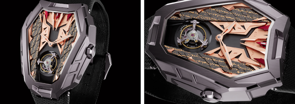 In effetti la cassa del nuovo segnatempo, in titanio grado 5, esce dagli schemi. A prima vista ricorda lo stile dei cartoon giapponesi, misura mm 46.80 x 56.60, spessore 15.90 mm ed è nata parallelamente al movimento di forma a carica automatica, A/h 28.800, 19 rubini di cui due hanno, ognuno, sette sfere in ceramica, riserva di carica 44 h; la gabbia del tourbillon in titanio è leggerissima, compreso lo scappamento pesa 0,35 g; una lavorazione particolare, come se fosse la pelle di un serpente presenta sui due lati 40 scaglie sottilissime (mm 0,30 di spessore) in fibre di carbonio trattate oro rosa e rutenio. Il quadrante è protetto da un doppio cristallo zaffiro, il secondo è a ore 6 per permettere una più completa visione del tourbillon. Il cinturino è in tessuto high tech e la fibbia in titanio grado 5. Ogni componente è realizzato in Svizzera e l’ambizione dell’azienda è di affiancare a questo primo movimento anche altre complicazioni. La tiratura della Referenza EP 01/Cyborg Exoskeleton Tourbillon Super Structurae, è limitata a nove esemplari.