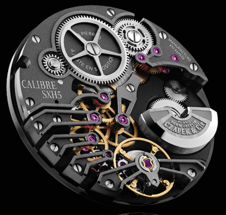 Ed eccoci finalmente al movimento, il Calibro automatico SX-H5, concepito in house, 38 rubini, A/h 28.800, carica 56 h, un bariletto, bilanciere a inerzia variabile, microtore in platino con con massa in oro; finiture accurate anche eseguite manualmente.